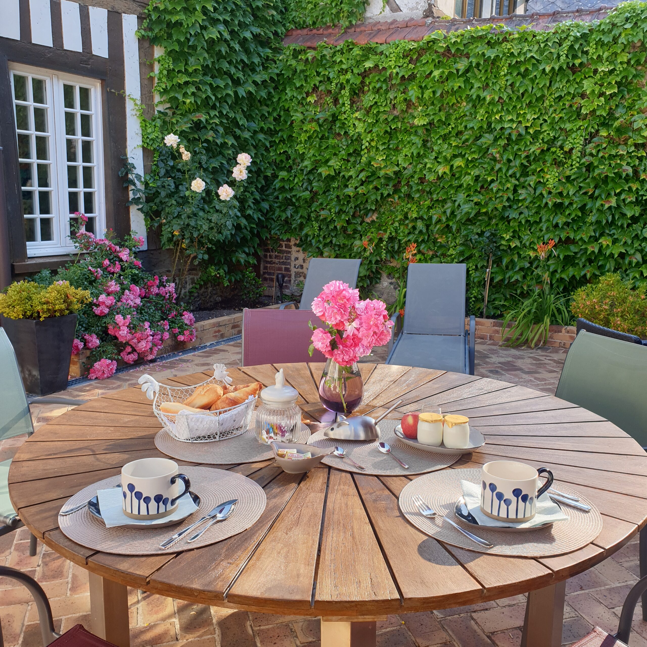 Le matin, vous pourrez déguster un petit-déjeuner composé de produits frais : croissants, pain, beurre de Normandie, confitures... En été, vous aurez l'occasion de le prendre sur la terrasse.